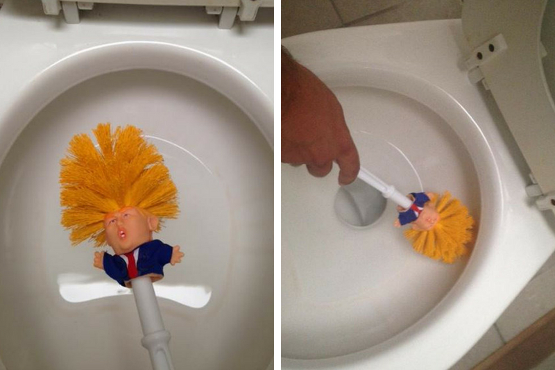 m sich bei den aktuellen politischen Themen nicht komplett die Stimmung vermiesen zu lassen, kommen immer neue Produkte und Artikel auf den Markt, die ein politisches Statement der ganz anderen Art und Weise setzen. So wird Präsident Trump beispielsweise zum internationalen Satire-Star und hält den orangefarbenen Kopf als Klobürste in die Toilettenschüssel seiner Gegner. Na wenn das einen nicht zur häufigen Kloreinigung motiviert...
